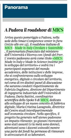 Padova settembre 2025: MICS: Made in Italy e Made in Science insieme per lo sviluppo del territorio