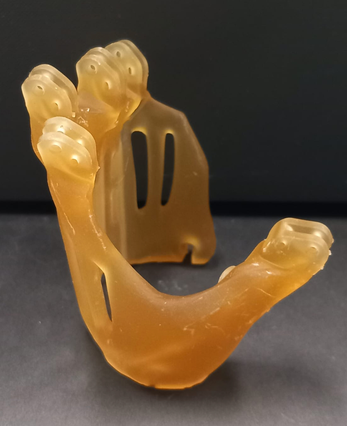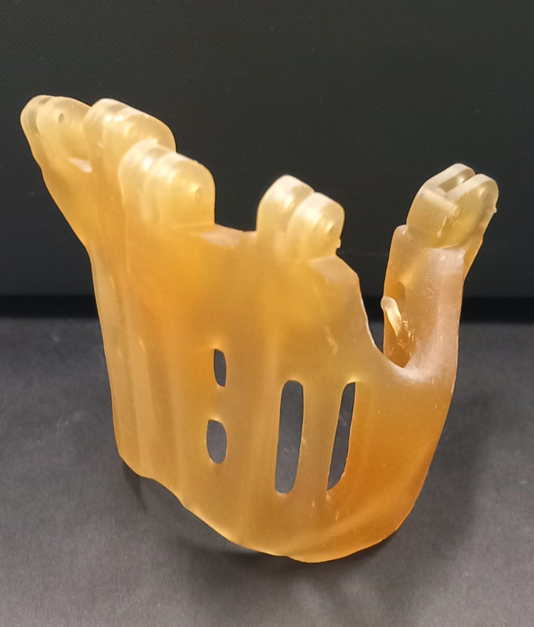 Composito bio-based stampato in 3D a partire da una resina fotoreticolabile derivata dall’olio di soia (AESO) caricata con un biofiller derivante da scarti alimentari della lavorazione del mais. Presenta una forma protesica di un metacarpo umano.
