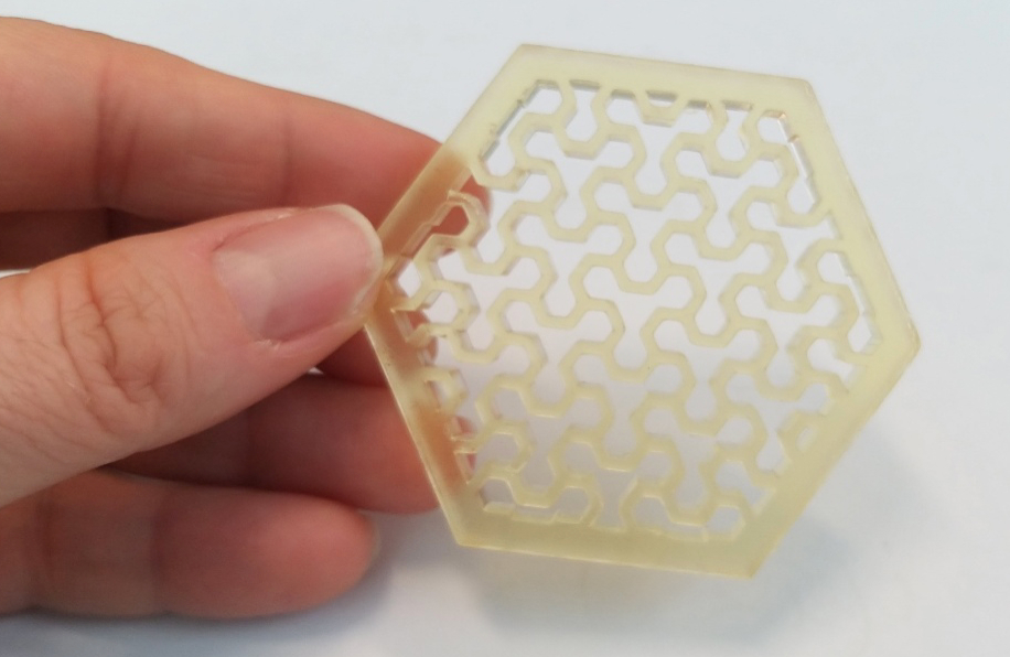 Composito bio-based stampato in 3D a partire da una resina fotoreticolabile derivata dall’olio di soia (AESO). Presenta una struttura esagonale caratterizzata da un pattern interno complesso con pareti sottili e cave interconnesse.