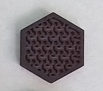 Composito bio-based stampato in 3D a partire da una resina fotoreticolabile derivata dall’olio di soia (AESO) caricata con un biofiller derivante da scarti alimentari della lavorazione del vino. Presenta una struttura esagonale caratterizzata da un pattern interno complesso con pareti sottili e cave interconnesse.