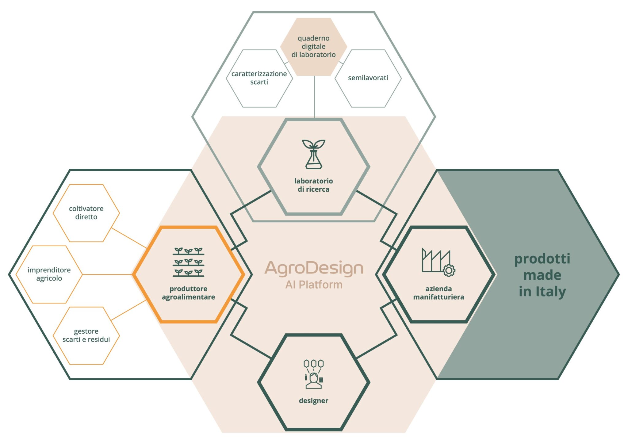 La piattaforma funziona come hub collaborativo che connette industrie agroalimentari, gestori di rifiuti, centri di ricerca, aziende manifatturiere e designer, favorendo la condivisione dei dati e la co-progettazione di soluzioni di economia circolare.