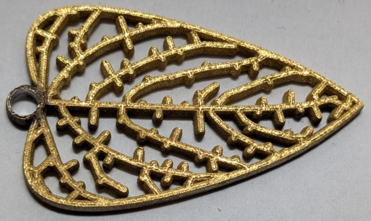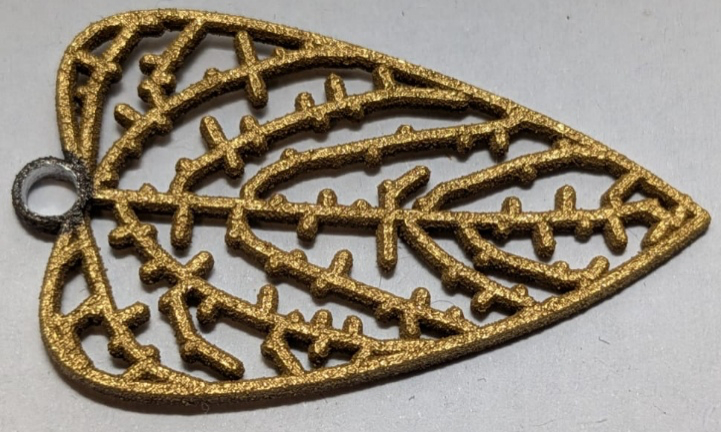 Stampa di ciondoli a forma di foglia mediante tecnologia Laser Powder Bed Fusion equipaggiata con sorgente laser che emette a lunghezza d’onda dell’infrarosso a partire da polveri in acciaio e lega di alluminio.