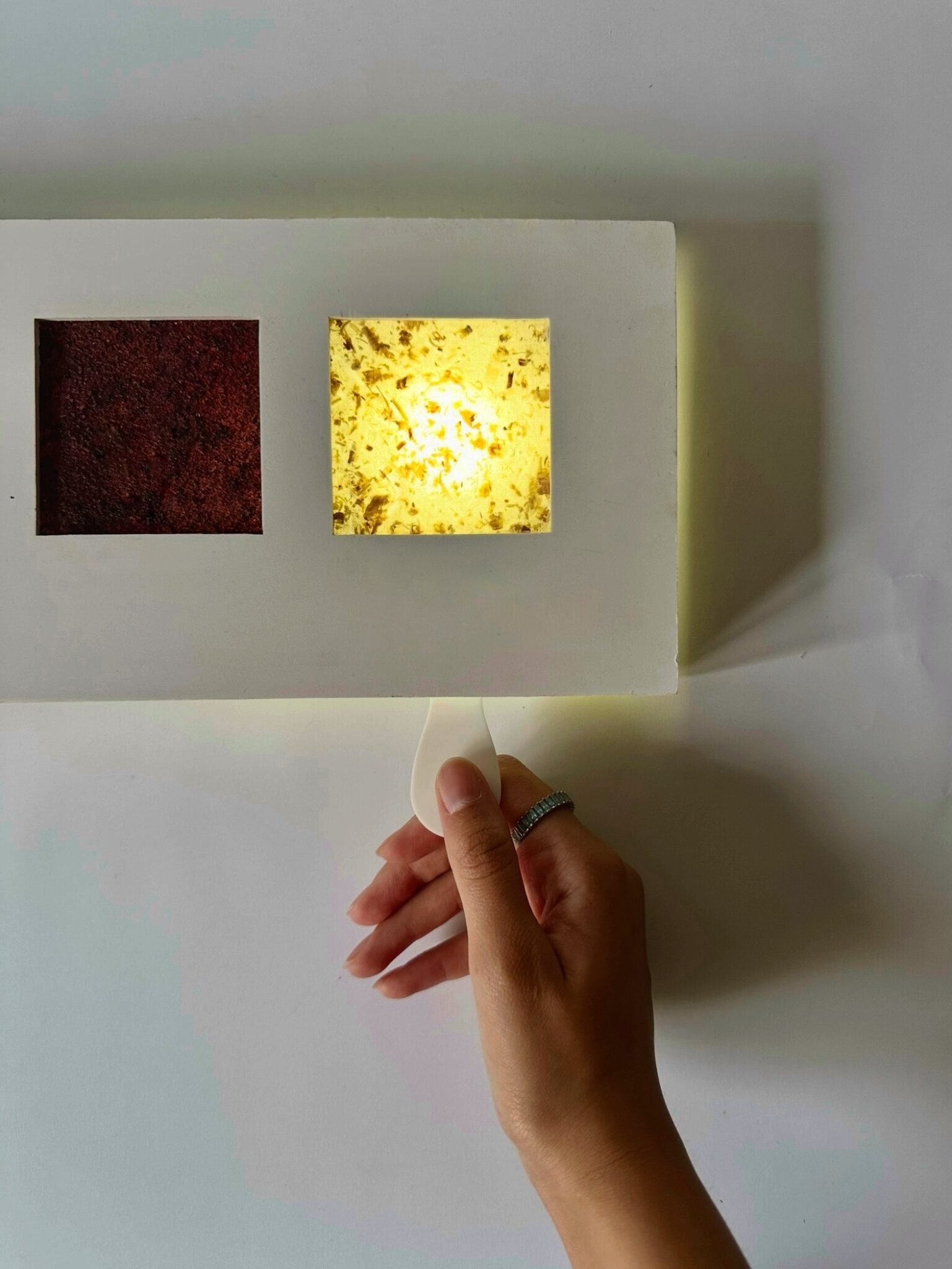 Campionario di diverse versioni di divergent wood ottenuti includendo in biomateriali scarti di legno di falegnameria post-produzione.