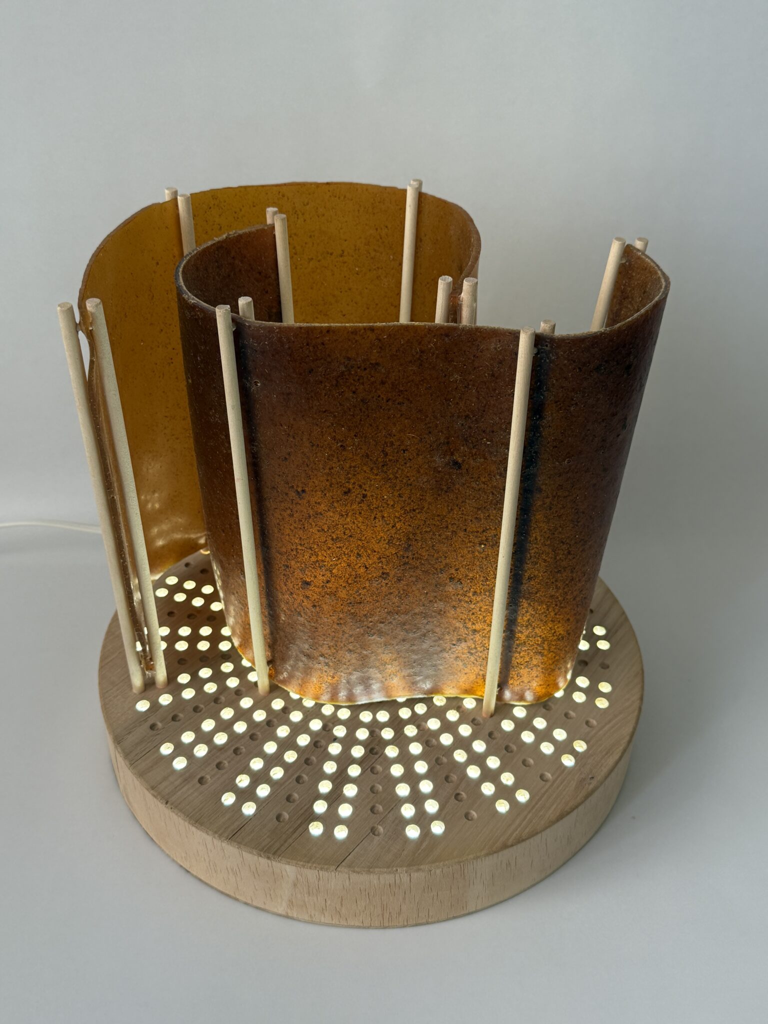 La DW Lamp è una lampada flessibile e versatile realizzata con scarti di falegnameria e legno divergente flessibile e trasparente.