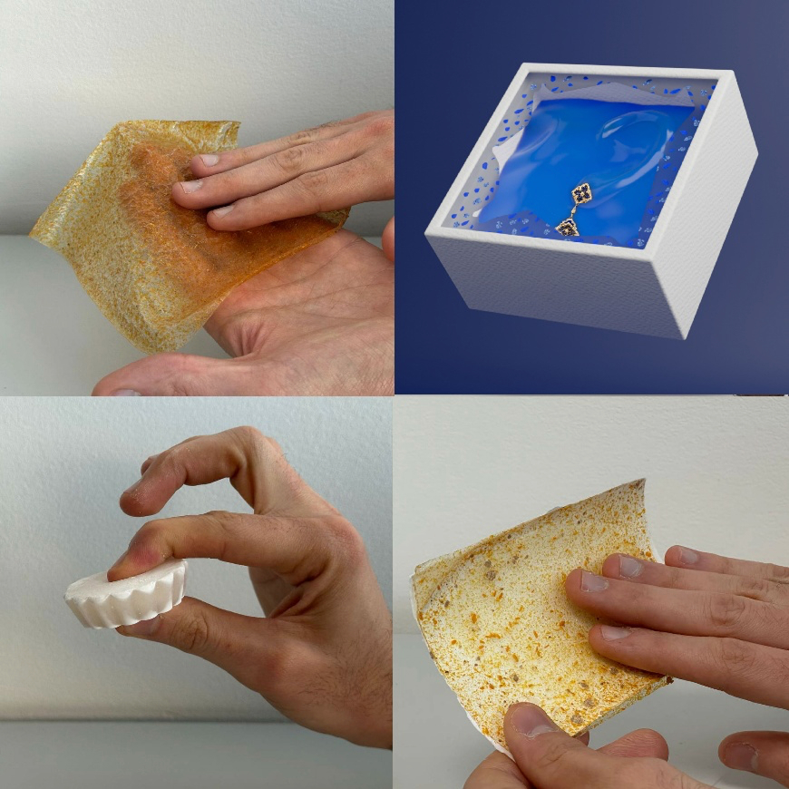 Scatole per il confezionamento di gioelli/piccoli oggetti, realizzate con carta riciclata valorizzata con materiale derivato da sottoprodotti agroalimentari (lavorazione del carciofo e del pomodoro, e scarti non edibili della produzione di pasta) e vegetali (bacche e petali di fiori) seguendo i principi dell’economia circolare.