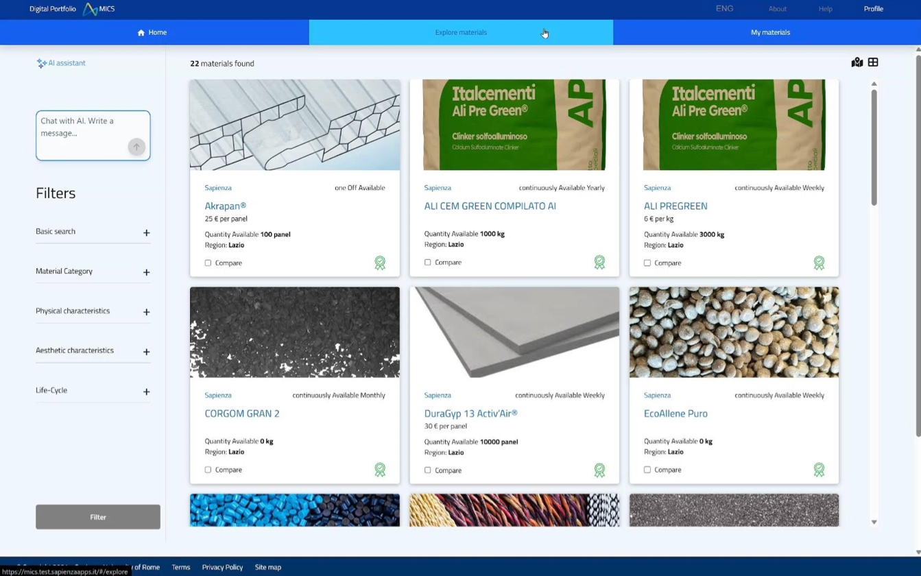 L’interfaccia principale consente di esplorare i materiali circolari tramite una mappa o una griglia, facilitato da filtri e AI chat, oltre a una funzione di confronto affiancato che permette di visualizzare le differenze di impatto ambientale.
